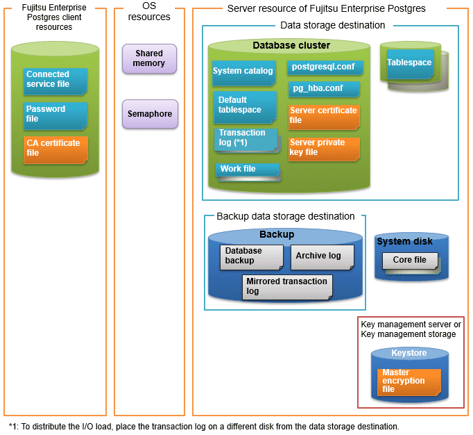 The following figure shows the configuration of the Fujitsu Enterprise Postgres operating environment. The tables given below list the roles of the OS resources and Fujitsu Enterprise Postgres resources.