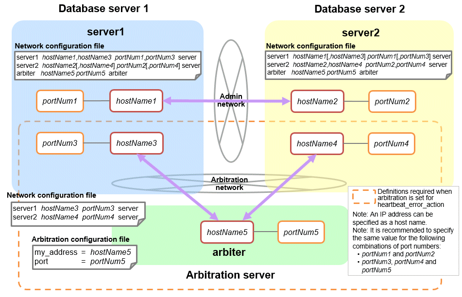 Refer to the diagram below for the relationship between the host names and IP addresses or port numbers specified in the network configuration file (network.conf) and arbitration configuration file (arbitration.conf).