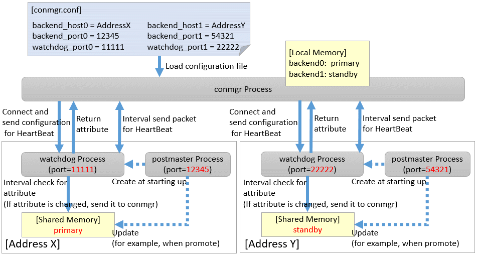 The conmgr process connects to this port, but the user application does not. you must set it to the same value as watchdog.port parameter in postgresql.conf. The value must be greater than or equal to 1 and less than or equal to 65535. The default is 27545. Append the instance number as you would for backend_host parameter. You must restart conmgr process for this parameter change to take effect.