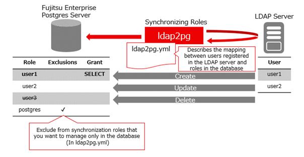 ldap2pg allows users registered with the LDAP server to be synchronized with Fujitsu Enterprise Postgres roles, so that the above database server roles can be created automatically. This allows you to centrally manage roles on the LDAP server. Note that ldap2pg only supports Linux.