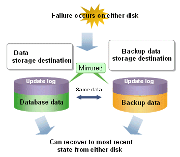 Fujitsu Enterprise Postgres retains a duplicate (mirror image) of the update log after backup execution on the data storage destination and on the backup data storage destination. Therefore, the data on one disk can be used to recover to the most recent state of the database even if a disk failure has occurred on the other.