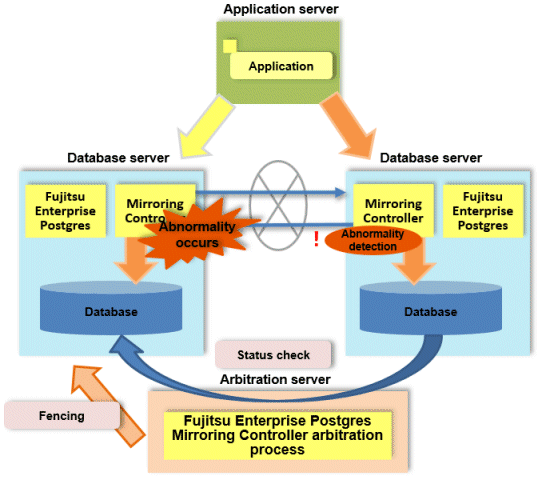 Fujitsu Enterprise Postgres not only mirrors a database using the PostgreSQL streaming replication feature, but also provides simplified switchover and standby disconnection features as well as a feature to detect faults in elements that are essential for the continuity of database process, disk, network, and other database operations.