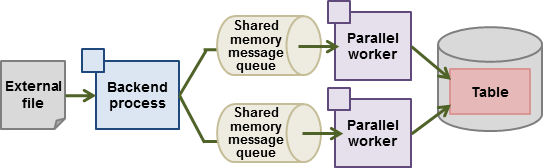 High-speed data load uses a single backend process collaborating with multiple parallel workers to perform data load in parallel. Data is exchanged between the backend process and parallel workers via shared memory message queues. The backend process distributes the loaded data of external files to multiple parallel workers. Each parallel worker then converts the data loaded from the shared memory message queue into the appropriate internal format, and inserts it into the table. If the table has indexes, their keys are extracted and inserted into the index page.