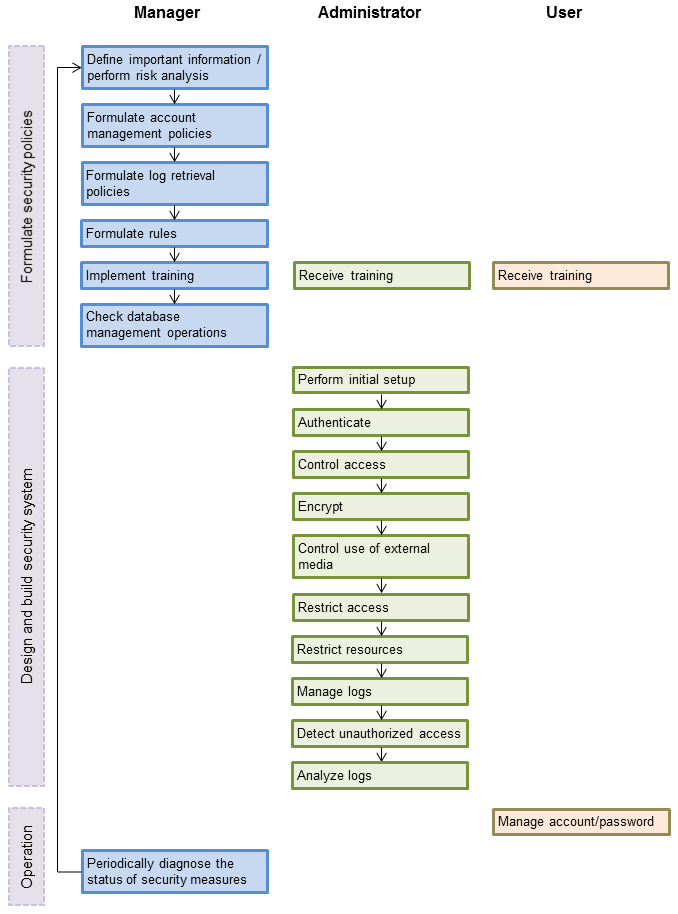 When performing security operation, there are technical measures to be implemented to address security threats by equipping the system with security features, and manual work, such as the implementation of security guidelines, a training system, and the establishment of usage rules.