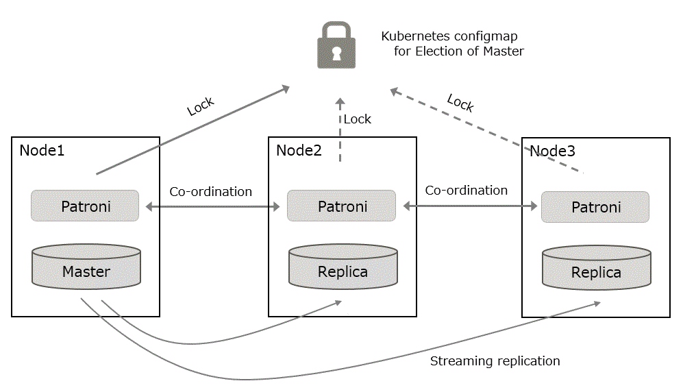 The high availability and failover management of FEP is provided by Patroni. Both Patroni and FEP will be installed on the same container image. Patroni will then initialize and start an FEP instance. Patroni will then acquire a lock on a shared resource. In our case, it is a Kubernetes configmap. Whichever POD that can acquire the lock will become the Master. When subsequent FEP server container starts, Patroni will initialize that POD as a Replica with streaming replication.