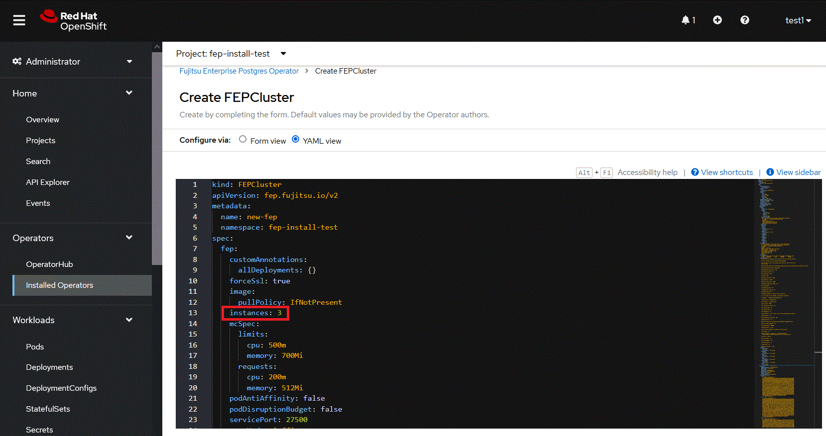 Instead of step 4 in "4.1 Deploying FEPCluster using Operator", change to the YAML view and specify '3' for the "instances" parameter of "fep" in "spec". Specify the storage class for the prepared shared storage for the backup and archive WAL volumes.