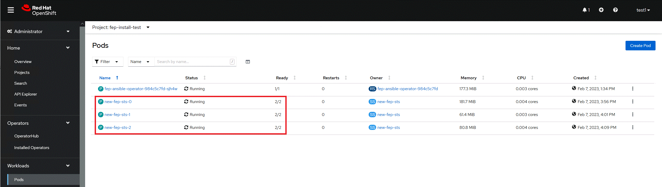 $ oc get pod -L feprole NAME READY STATUS RESTARTS AGE FEPROLE fep-ansible-operator-88f7fb4b-5jh85 1/1 Running 0 24m new-fep-sts-0 2/2 Running 0 17m master new-fep-sts-1 2/2 Running 0 15m replica new-fep-sts-2 2/2 Running 0 13m replica