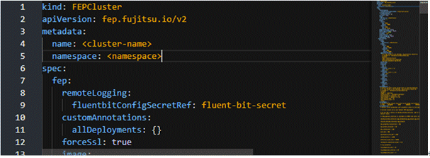 spec.fep.remoteLogging.fluentbitConfigSecretRef as shown below: