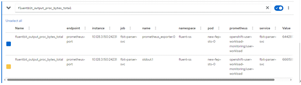 Once Prometheus starts scraping Fluent Bit metrics, you can view them in OpenShift's Observe-Metrics tab.